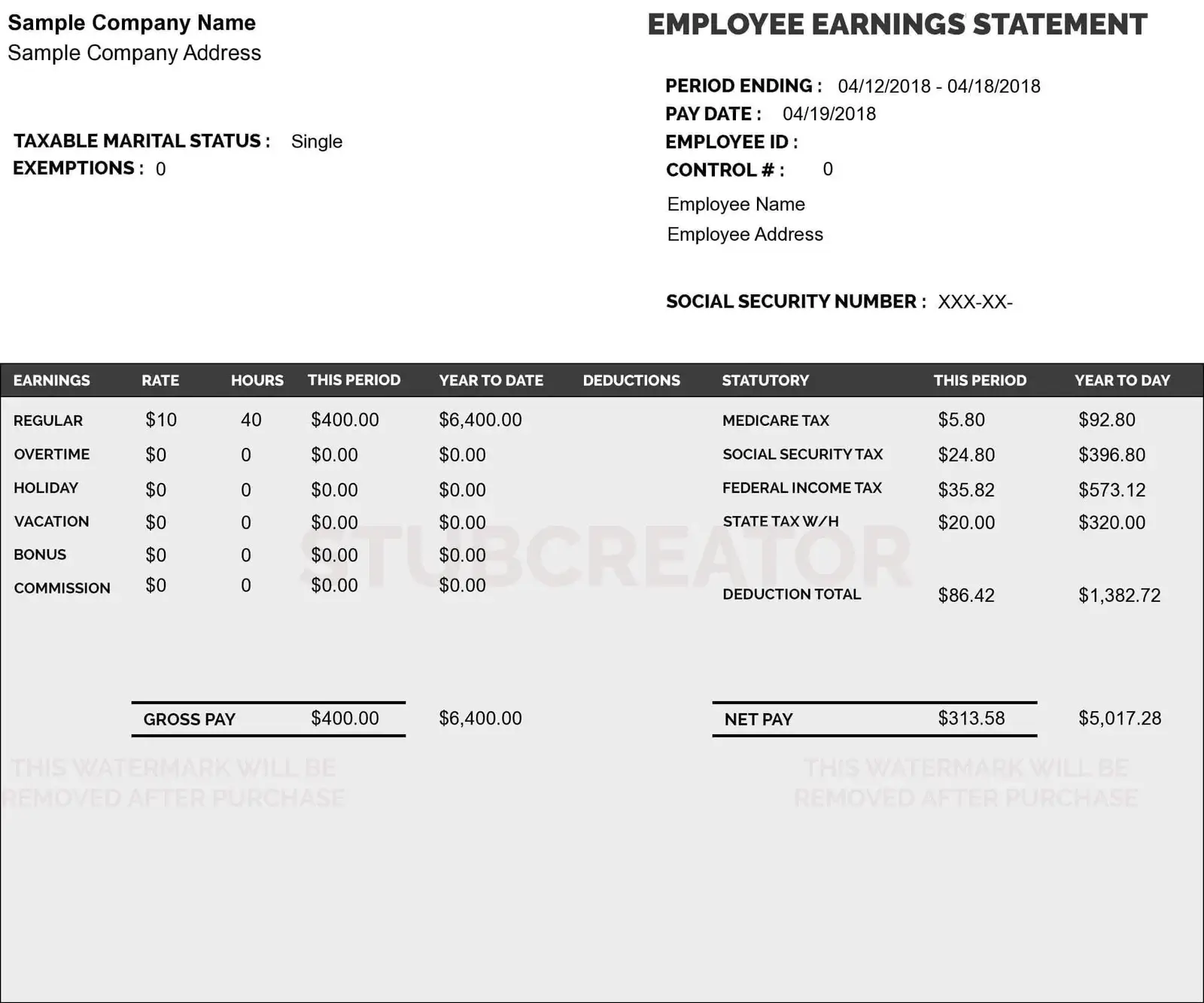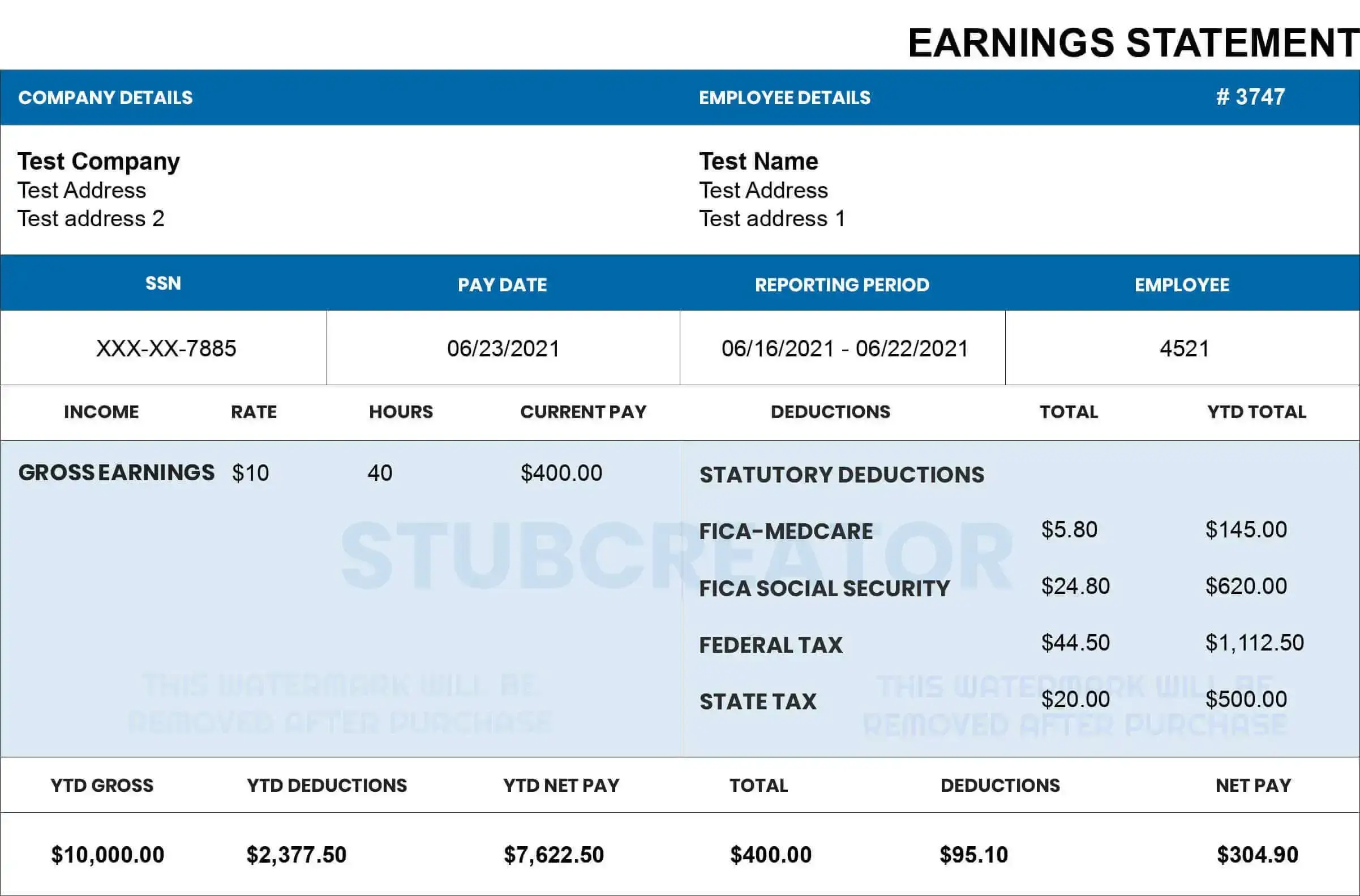 The sample of free check stub templates can be downloaded for reference. Also, the sample templates consist of Stub Creator watermark which will be removed as soon as you pay for the same. Since you are providing value to your employees in the form of stubs, it is great that you can choose the favorable pay stub template for them.